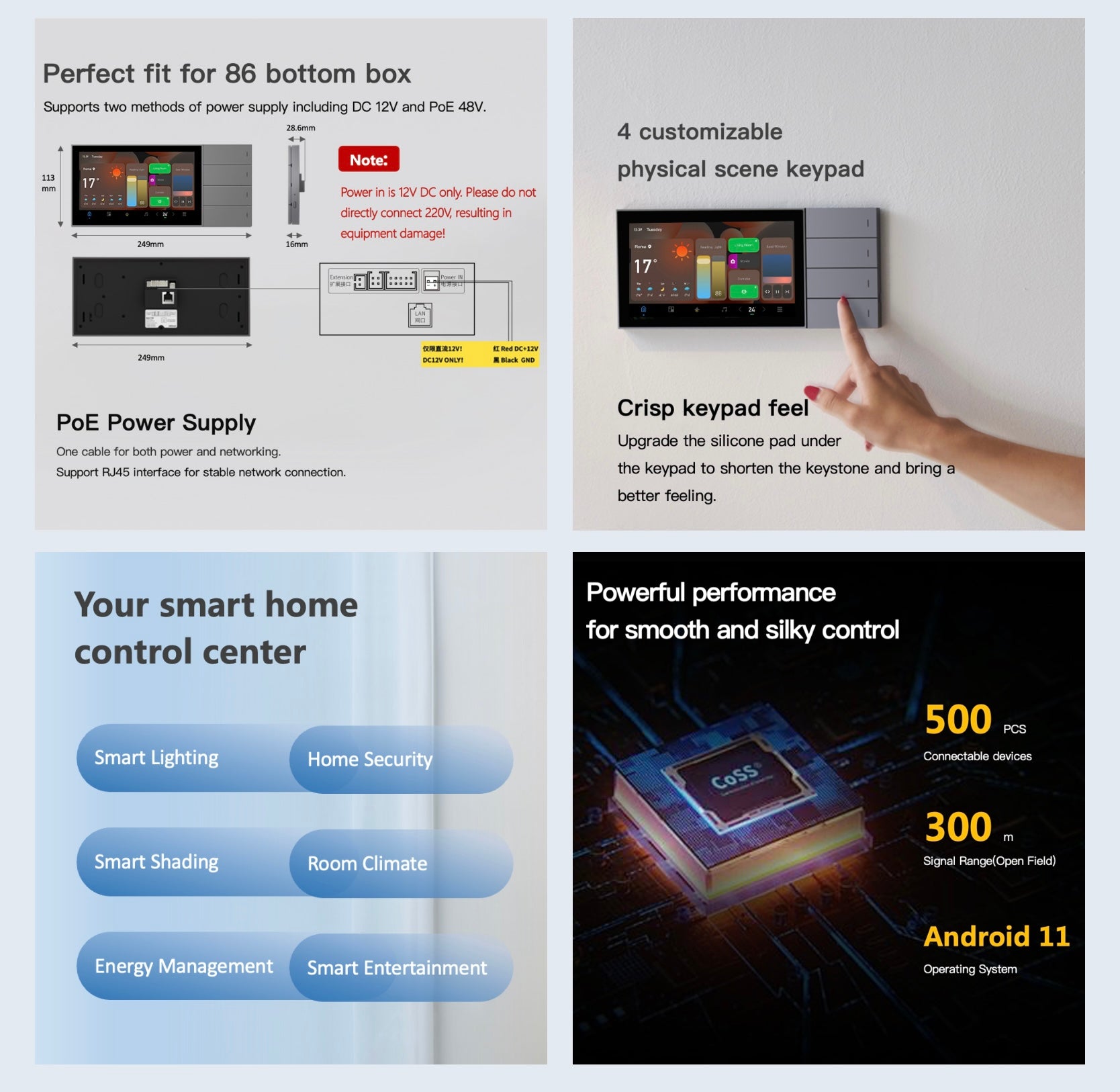 Nature 7 PRO ist ein Vollbild-Bedienfeld mit allen intelligenten Steuerungsfunktionen und ermöglicht die Steuerung verschiedener Smart-Home-Geräte und das Umschalten zwischen verschiedenen intelligenten Szenen wie "Abseind", "Sleep", "Film oder "Dinner". Insbesondere kann ein Benutzer mit Nature 7 PRO genau steuern, in welchem Maße ein Vorhang sich öffnet und schließt. Stimmen Sie die Helligkeit und Farbe einer Lampe ein oder passen Sie die Temperatur einer Klimaanlage an. Ein wirklich intelligentes Leben genießen. Das in die Wand eingebettete intelligente Panel kann mit einem 7-Zoll-Touch-Panel und einer standardmäßigen 86-mm-Basis leicht in das Design von Häusern integriert werden. Es ist nicht nur eine persönliche intelligente Haushälterin an Ihren Fingerspitzen, sondern auch ein intelligentes Immobilienterminal in Ihrer Reichweite.